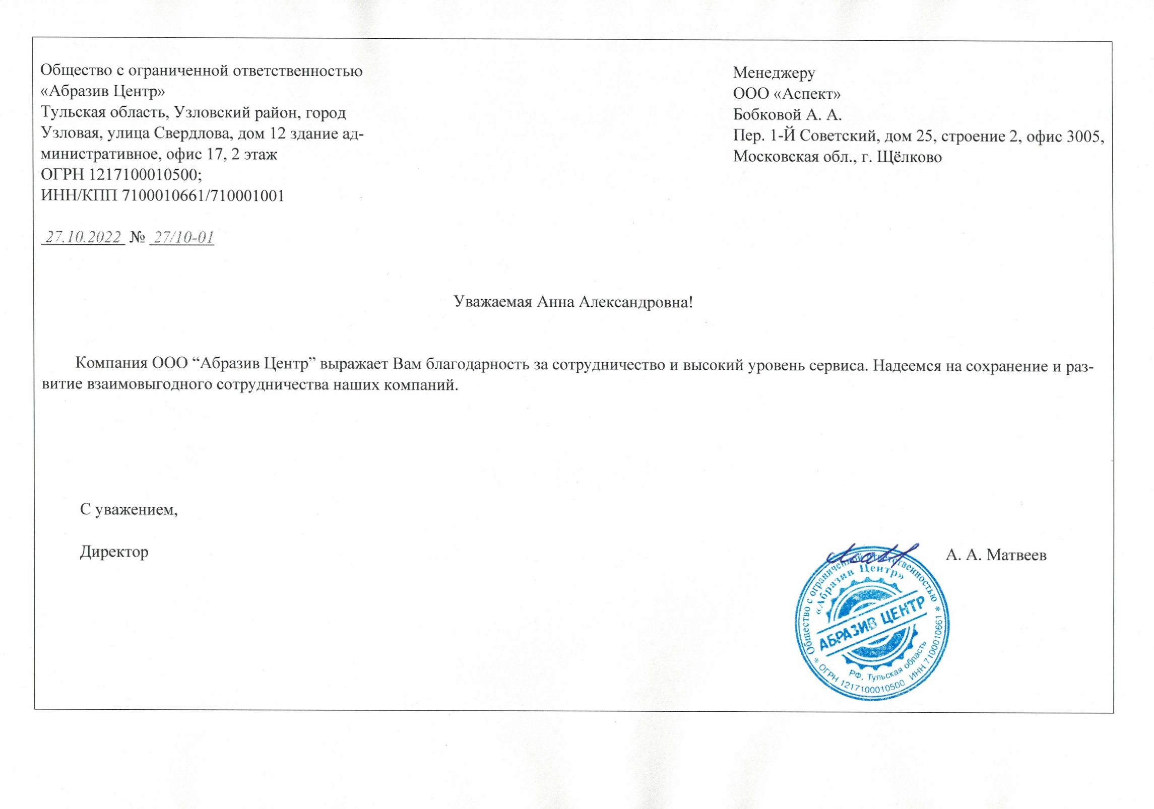 Уважаемая Анна Александровна! Компания ООО "Абразив Центр" выражает Вам благодарность за сотрудничество и высокий уровень сервиса.