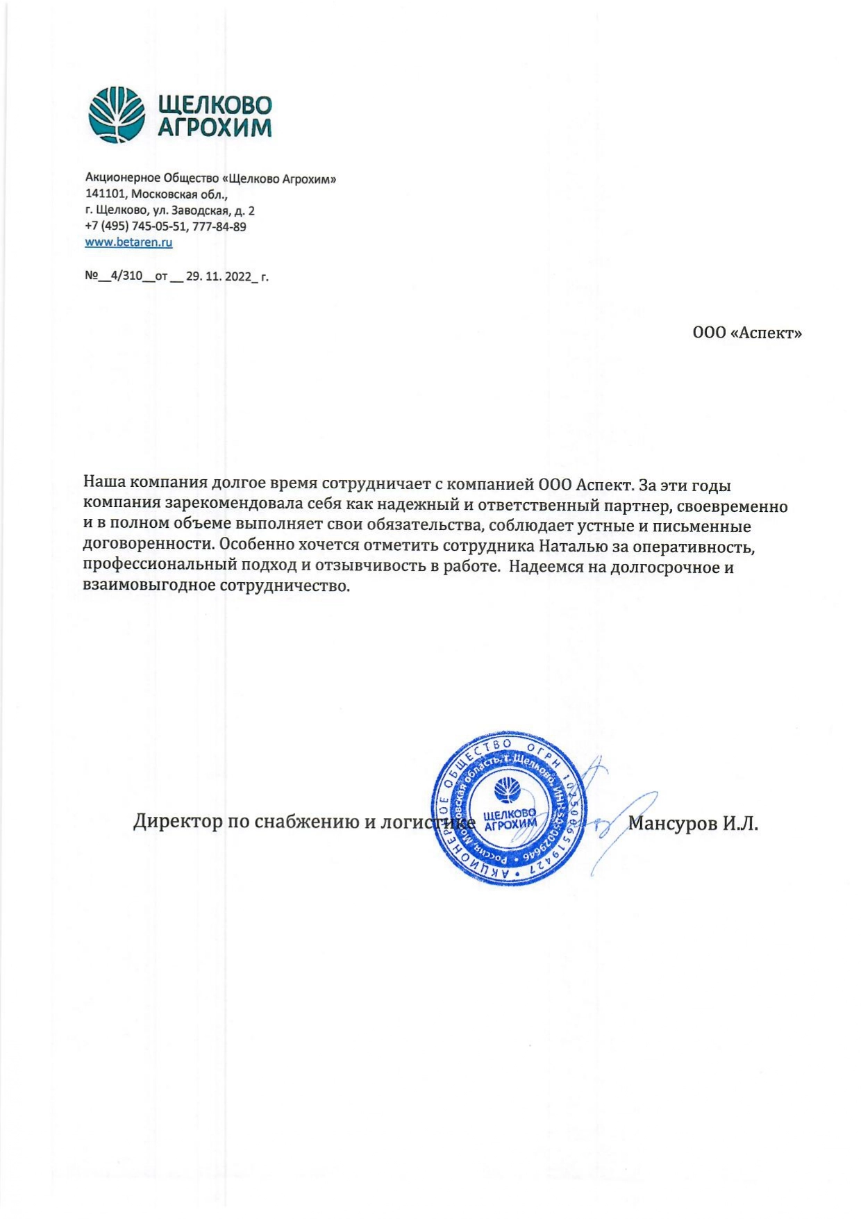 Сообщаем, что наша организация давно сотрудничает с ООО "Аспект". Компания ООО "Аспект" своевременно и в полном объеме исполняет свои обязательства, соблюдает устные и письменные договоренности. ООО "Пк Экостоун" рекомендует ООО "Аспект" в качестве делового партнера и контрагента.